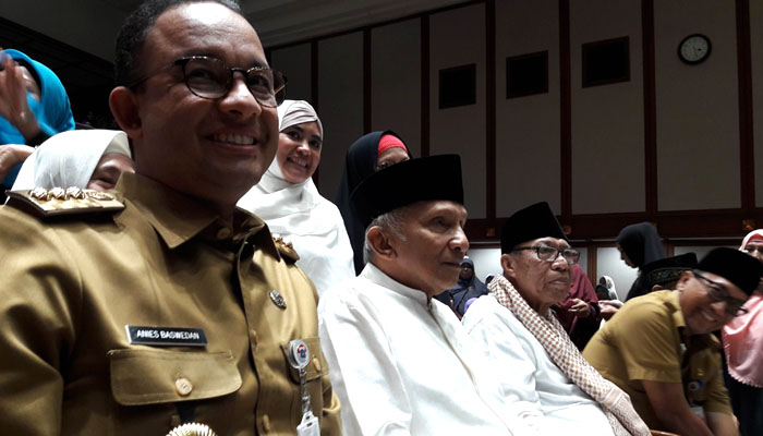 Mantan Ketua MPR RI itu memberikan ceramah dalam peringatan satu tahun ‘Ustazah Peduli Bangsa’ di ruang Balai Agung, Balaikota Jakarta. Ceramah Amien sempat terpotong saat Anies masuk ruangan.