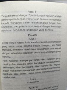 Pasal 8 menyebutkan: “Dalam melaksanakan profesinya wartawan mendapat perlindungan hukum.” Namun Koordinator Nasional FWK Raja Parlindungan Pane mempertanyakan efektivitasnya.