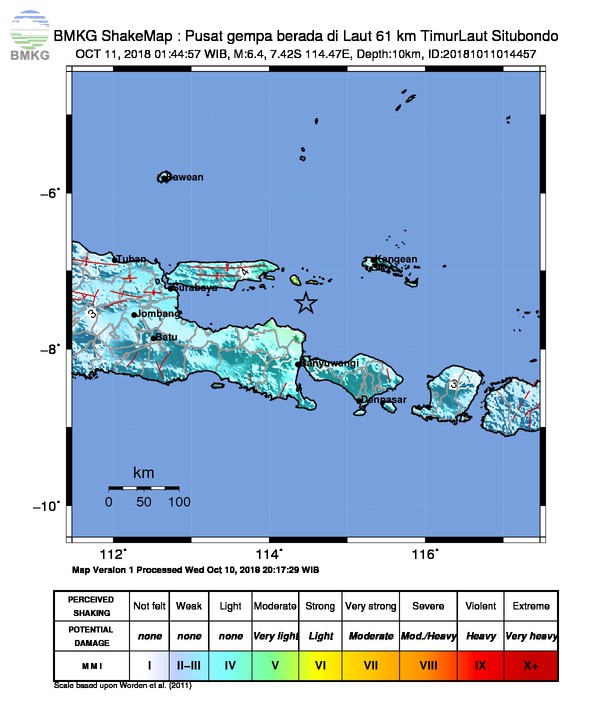 Mimbar-Rakyat.com (Jakarta) – Hari Kamis, 11 Oktober 2018, pukul 01.44.57 WIB, wilayah timur laut Situbondo terjadi gempa tektonik di laut. Hasil analisis BMKG menunjukkan informasi awal gempa ini berkekuatan M=6,4.