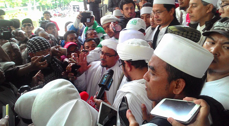 Dari gedung Pusdai Jabar, di Jalan Diponogoro, Kota Bandung, ribuan santri dan anggota FPI bertahan. Mereka rela menunggu kehadiran Habib dari Polda Jabar.