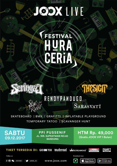 MIMBAR-RAKYAT.com (Bandung) – “JOOX Live Festival Hura Ceria” akan digelar Sabtu 9 Desember 2017 di Lapangan PPI Pussenif Bandung, menampilkan musisi independen lokal terkenal, seperti Seringai, The SIGIT, Sarasvati, Rendy Pandugo dan Stars and Rabbit.
