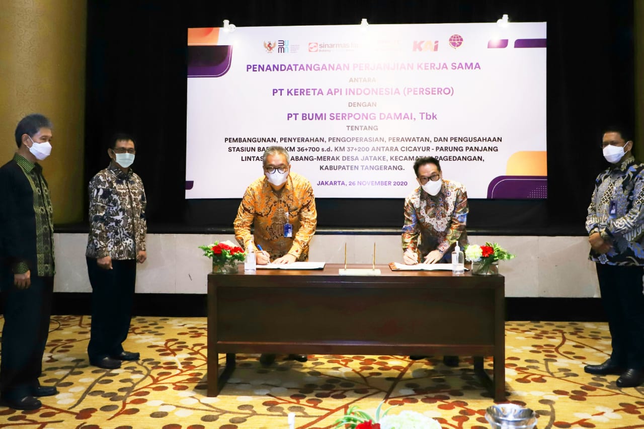 Mimbar-Rakyat.com (Jakarta) – PT Kereta Api Indonesia (Persero) dan PT Bumi Serpong Damai, Tbk sepakat menandatangani Perjanjian Kerja Sama (PKS) tentang Pembangunan, Penyerahan, Pengoperasian, Perawatan dan Pengusahaan Stasiun Baru, di Desa Jatake, Kecamatan Pagedangan, Kabupaten Tangerang dan terletak di antara Stasiun Cicayur dan Stasiun Parung Panjang.