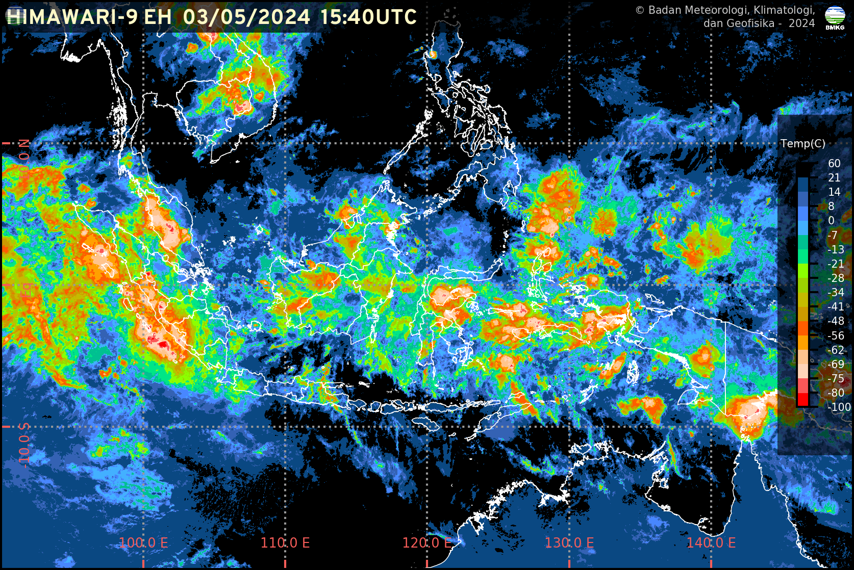 Kepala Pusat Meteorologi Publik, Andri Ramdhani, menyampaikan bahwa memasuki awal Mei 2024 ini, potensi hujan dengan intensitas lebat masih dapat terjadi dalam sepekan kedepan di beberapa wilayah Indonesia, seperti di sebagian Sumatra Barat, Riau, Sumatra Selatan, Kalimantan Barat, Kalimantan Tengah, Kalimantan Utara, Kalimantan Timur, Kalimantan Selatan, Sulawesi Tengah, Sulawesi Barat, Sulawesi Selatan, Sulawesi Tenggara, Maluku, Maluku Utara, Papua Barat Daya, Papua Barat, Papua, Papua Tengah, Papua Pegunungan, dan Papua Selatan.