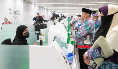Tim lapangan Paspor Arab Saudi dapat berkomunikasi dengan jemaah haji dalam 13 bahasa. Terlihat ketika petugas sedang melayani jemaah asal Indonesia. (Foto: SPA/Arab News)