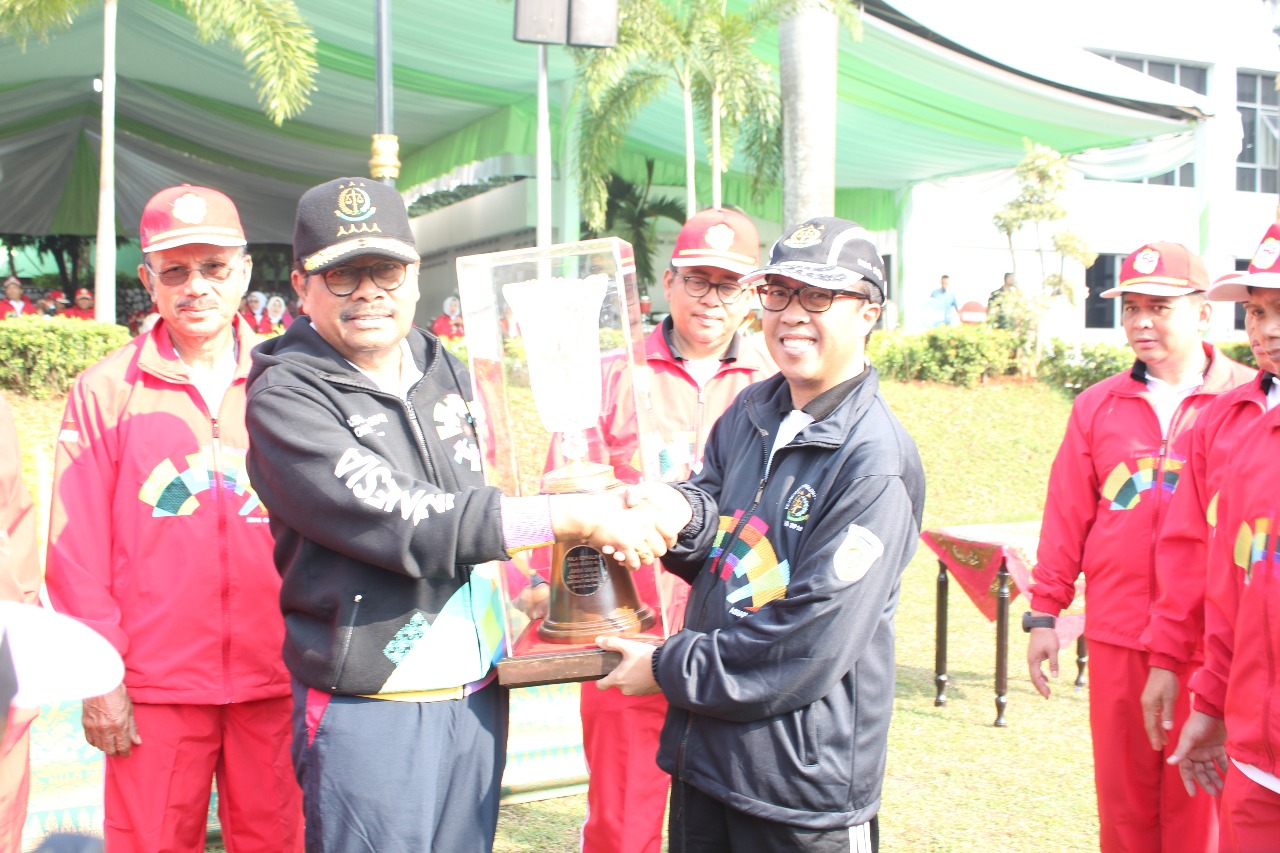 Dalam penutupan POR, di Lapangan Kejaksaan Agung, Kajati DKI Tony T. Spontana menerima Piala Juara Umum dari Jaksa Agung M. Prasrtyo, Rabu (18/7).
