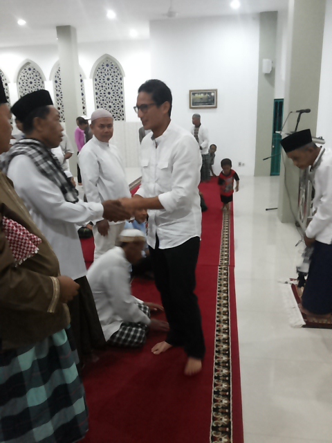 Usai melaksanakan salat Magrib, ibu-ibu dan remaja yang menunggu di tangga masjid masih terus meminta bersalaman sembari berfoto. Banyak di antaranya yang minta berfoto selfie ria, sehingga Sandi tak kuasa melangkahkan kakinya.