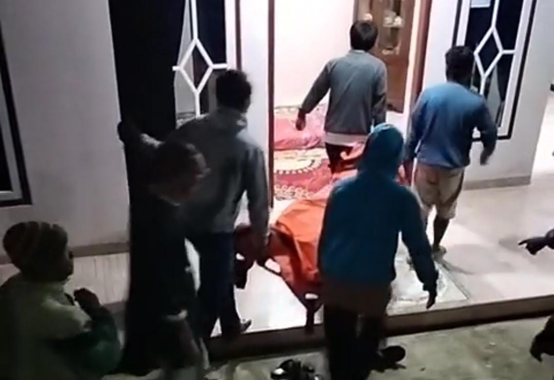 Nampak suasana haru dan diiringi isak tangis keluarga dan sanak saudara saat kedatangan jenazah Fahrurozi yang merupakan anak dari pasangan suami isteri Ahmad Yani dan Ikah Atikah.